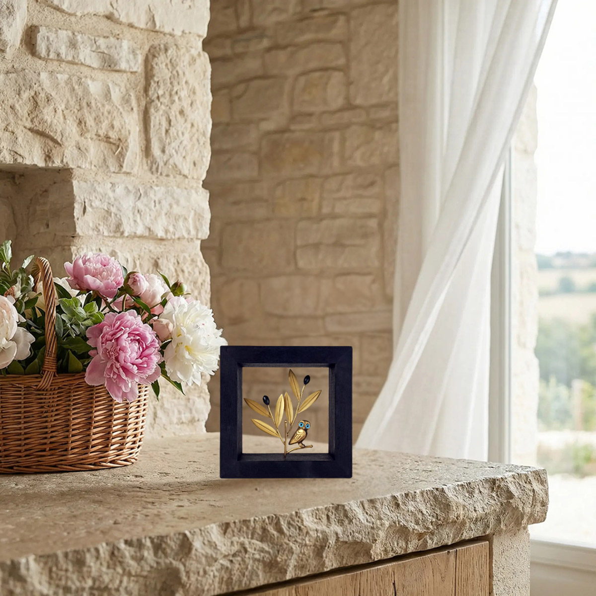 Ξύλινο Κάδρο 15X15cm με μπρούτζινη φιγούρα – Κουκουβάγια