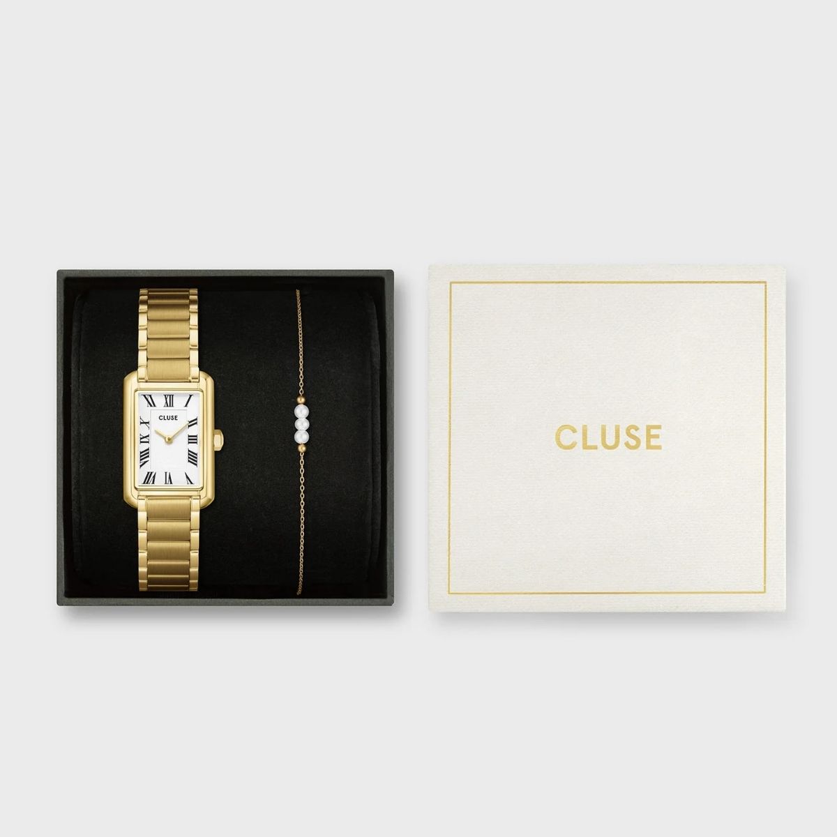 Αυτό το γυναικείο gift box της CLUSE περιλαμβάνει το γυναικείο ρολόι Belisenna και το Βραχιόλι με Αλυσίδα και Μαργαριτάρια σε χρυσό χρώμα. Το ρολόι Belisenna διαθέτει λευκό καντράν, θήκη 21 mm σε χρυσό χρώμα και λουράκι 3 συνδέσμων από ανοξείδωτο ατσάλι. Συνδυάστε το ρολόι με το χρυσό βραχιόλι που το συμπληρώνει.