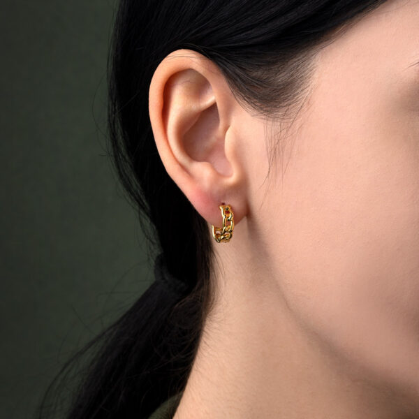 The Essentials embody refined effortlessness. Timeless staple hoops, studs or chain earrings with smooth lines that are perfect for everyday wear but can also work on special occasions by stacking them. The Beat Hoop Earrings with a thick curvy shape, made in brass and plated in a 2 micra 18K gold.