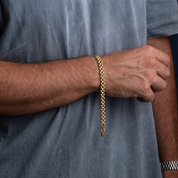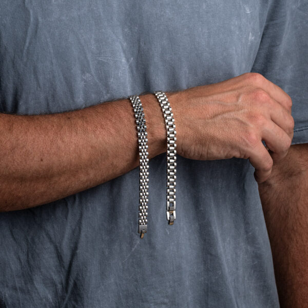 This bracelet is made of high-quality hypoallergenic stainless steel. The bracelet is also waterproof. It has a protective layer that reduces or completely nullifies the corrosion effect of water.