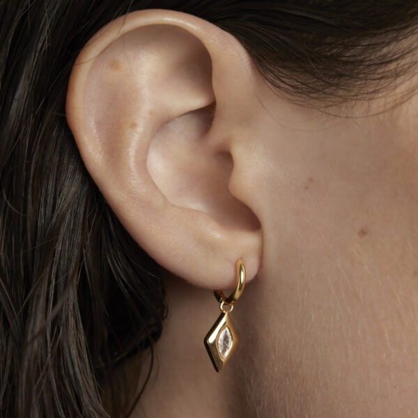 A REINVENTION OF THE BASICS The Essentials embody refined effortlessness. Timeless staple hoops, studs or chain earrings with smooth lines that are perfect for everyday wear but can also work on special occasions by stacking them. The Kate Drop Hoops have a hanging rhombus with an oval zirconia in the center, all plated in gold and made with Sterling Silver.