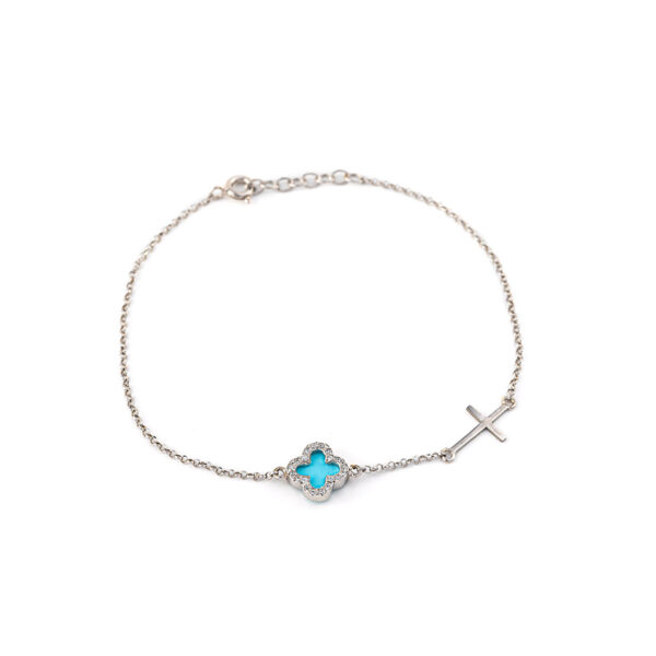 Sterling silver chain bracelet with turquoise cross adorned with white zircon stones.